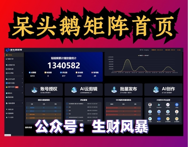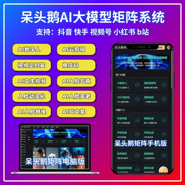 呆头鹅批量剪辑软件 AI数字人 小程序版 呆头鹅聊天视频制作软件 灵魂画手制作软件 直播切片制作软件 【第三款】呆头鹅矩阵系统 公众号矩阵系统 呆头鹅AI收录排名系统 私域运营系统 代理加盟开分站 【第四款】电脑软件版矩阵 【第一款】矩阵系统 【第二款】矩阵系统 AI智能写文案 |